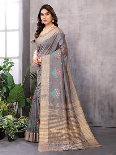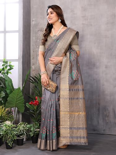 SIRIL Women's Cotton Bland Printed Zari Stripe Border Ready To Wear One Minute Saree With Unstitched Blouse Piece