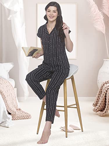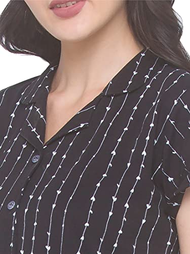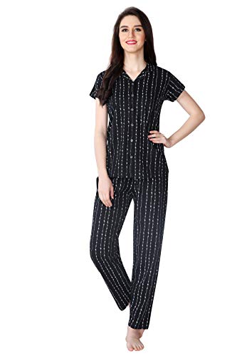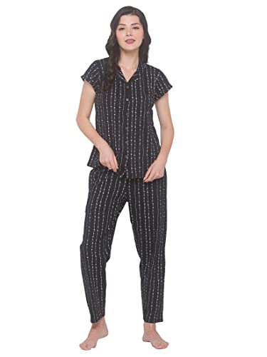 JISORA Women's Organic Black Printed Pure Cotton Pyjama Top Night Suit Set